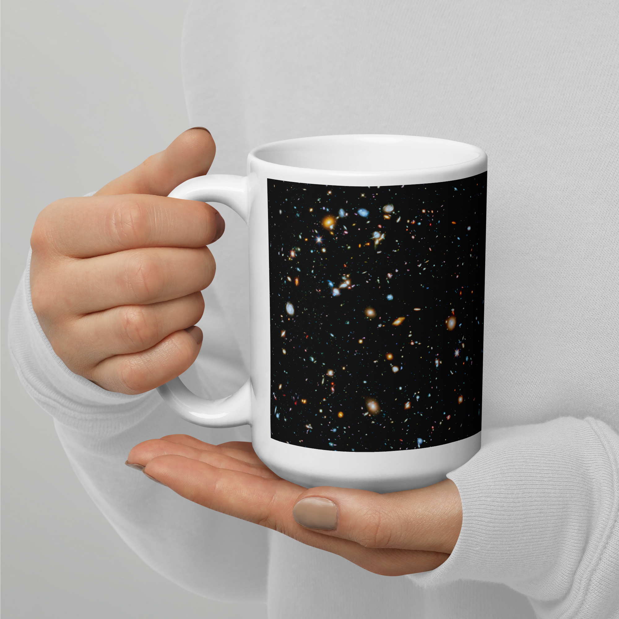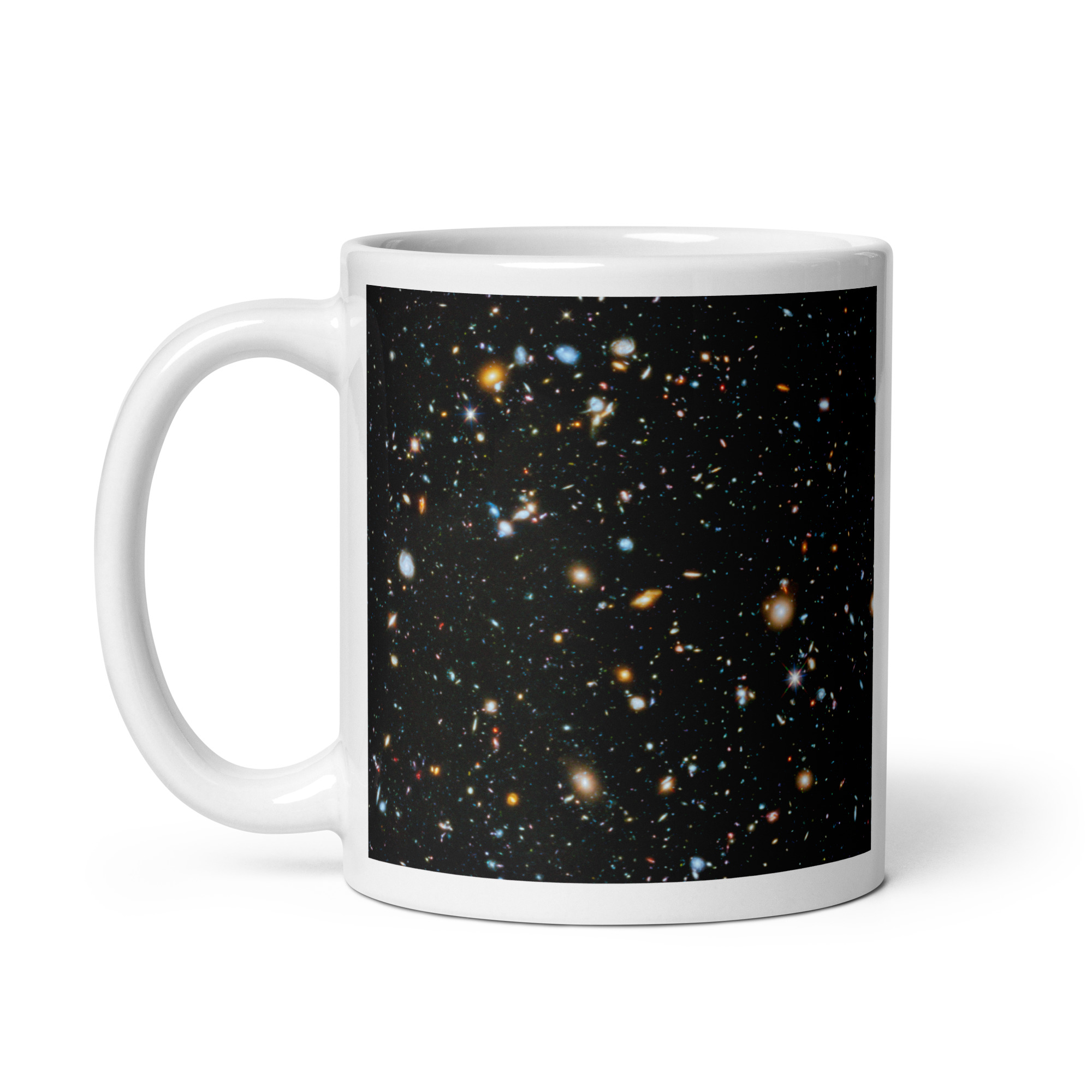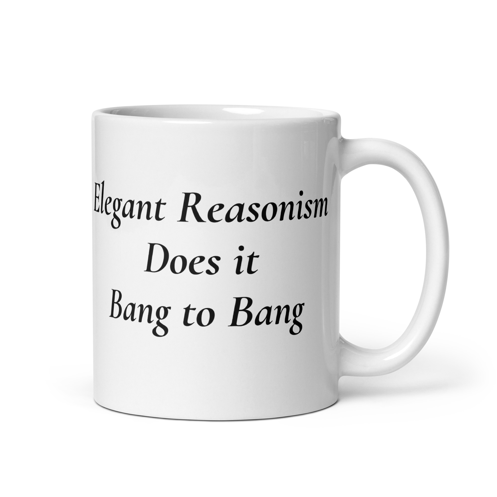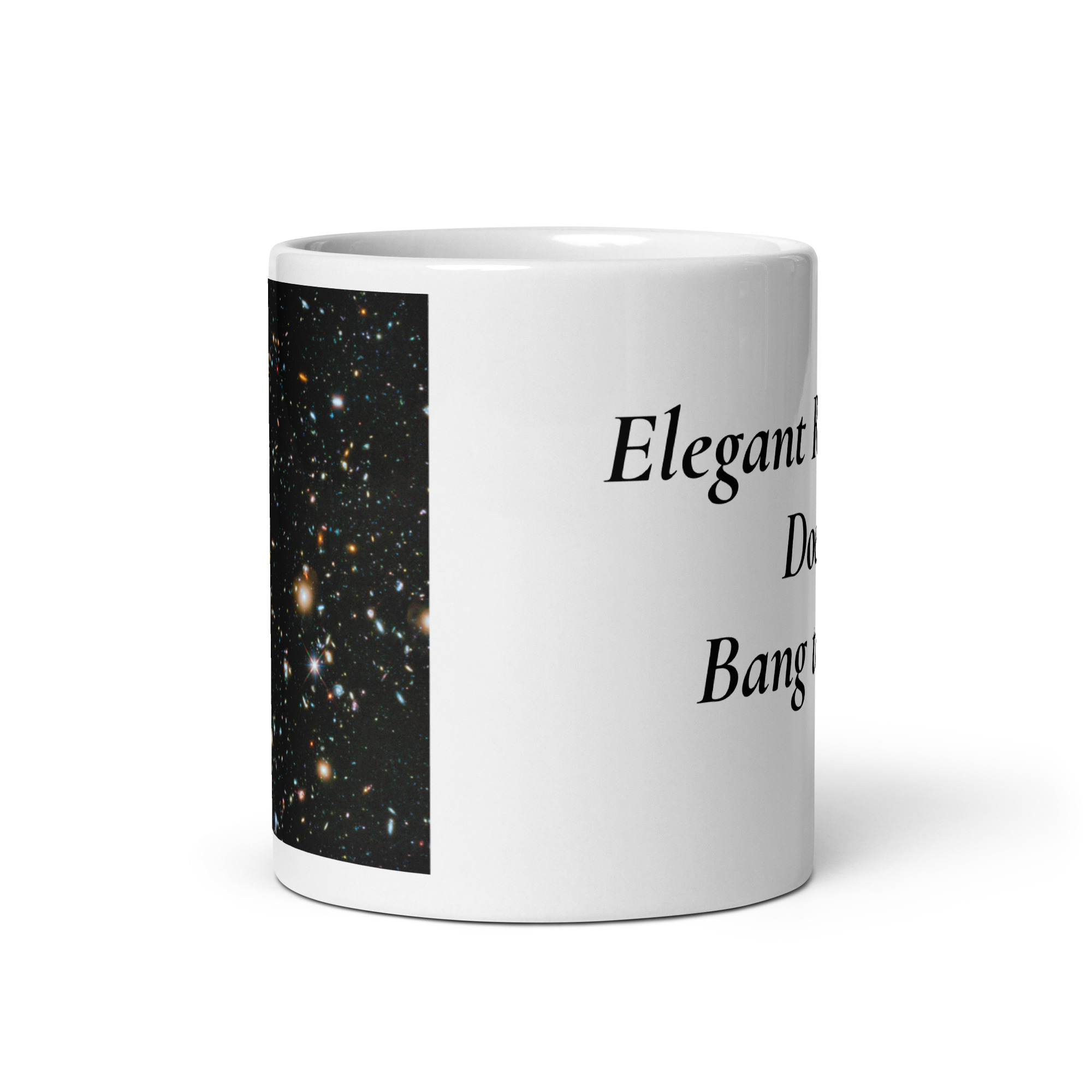 Whether you’re drinking your morning coffee, evening tea, or something in between – this mug’s for you! It’s sturdy and glossy with a vivid print of a Hubble Ultra Deep Field image and the words: Elegant Reasonism Does It Bang to Bang that’ll withstand the microwave and dishwasher.