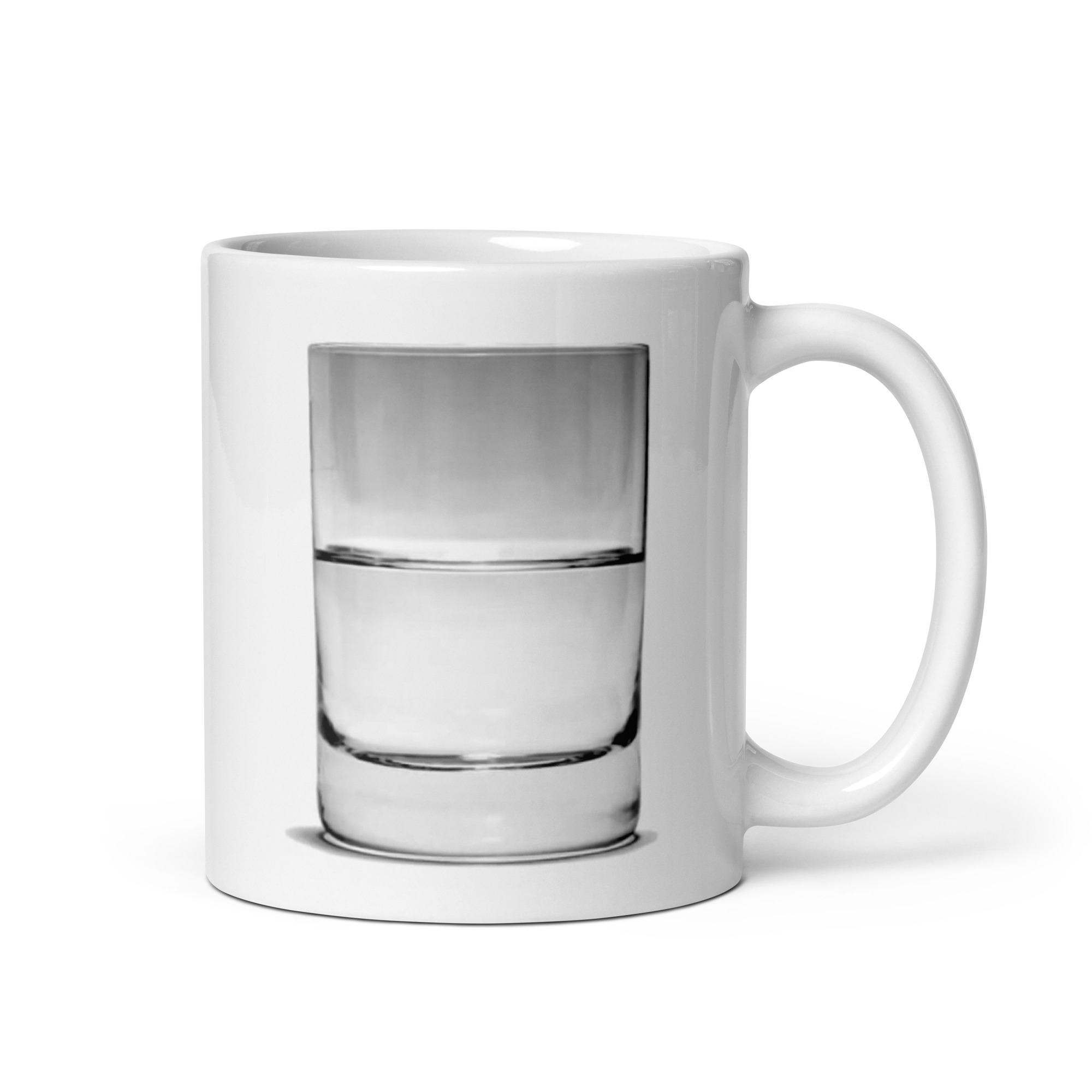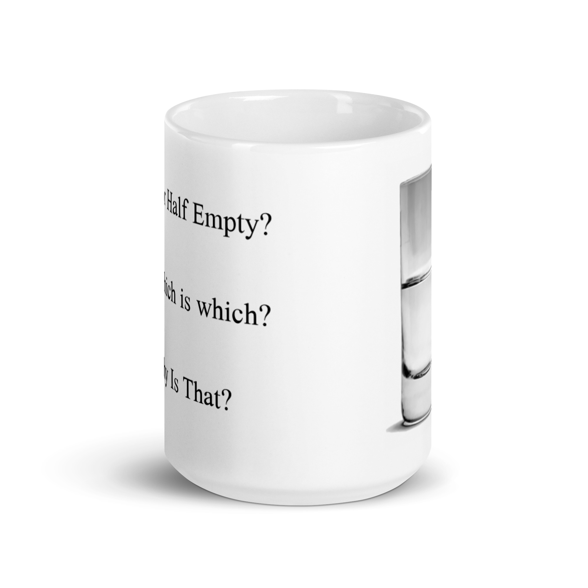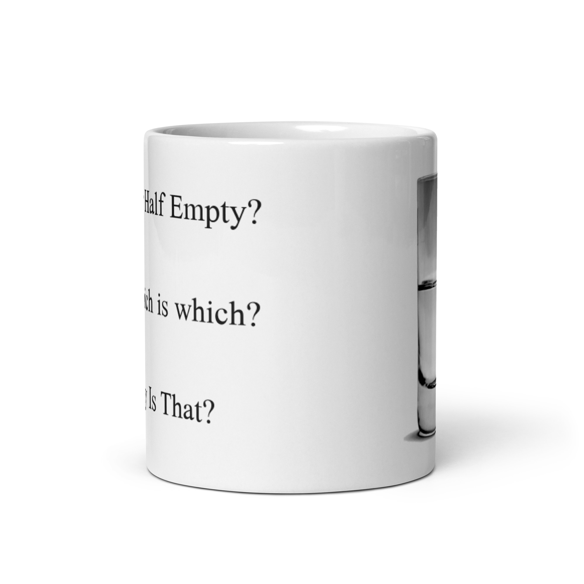 Many will think this the age old question about attitude. It is but with a twist. The intent with this prop is to call out presumptive arrogance. This is in reality an image of an inverted glass completely immersed in a clear liquid with an gas bubble holding it in place. The image has been inverted to give the illusion it is full of liquid. The point is to think and see, as you look. Look carefully at the meniscus inside the glass. The meniscus is inverted because the fluid is outside the glass, not in it. This page is the only page where we will post the answer to this riddle. Whether you’re drinking your morning coffee, evening tea, or something in between – this mug’s for you! It’s sturdy and glossy with a vivid print that’ll withstand the microwave and dishwasher.