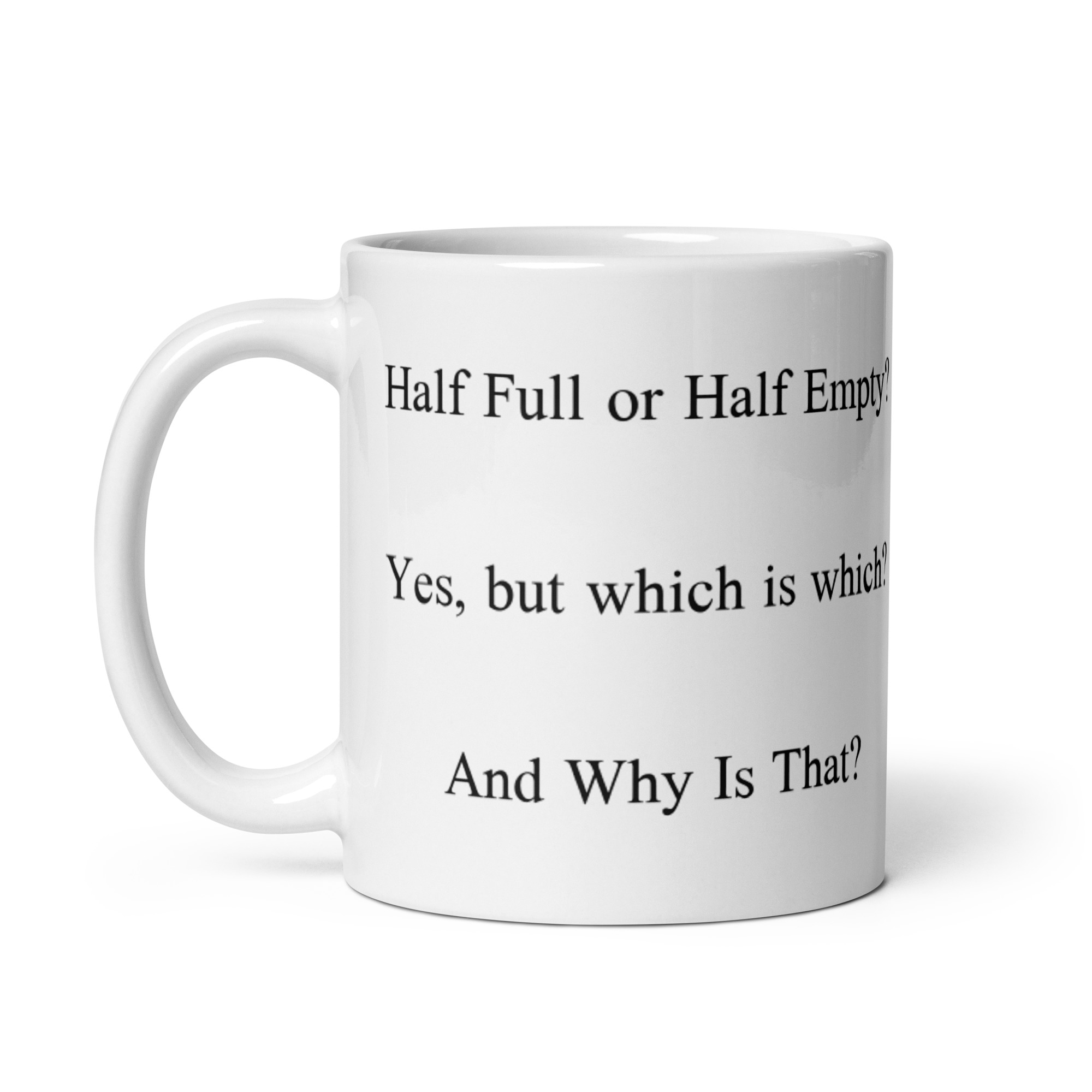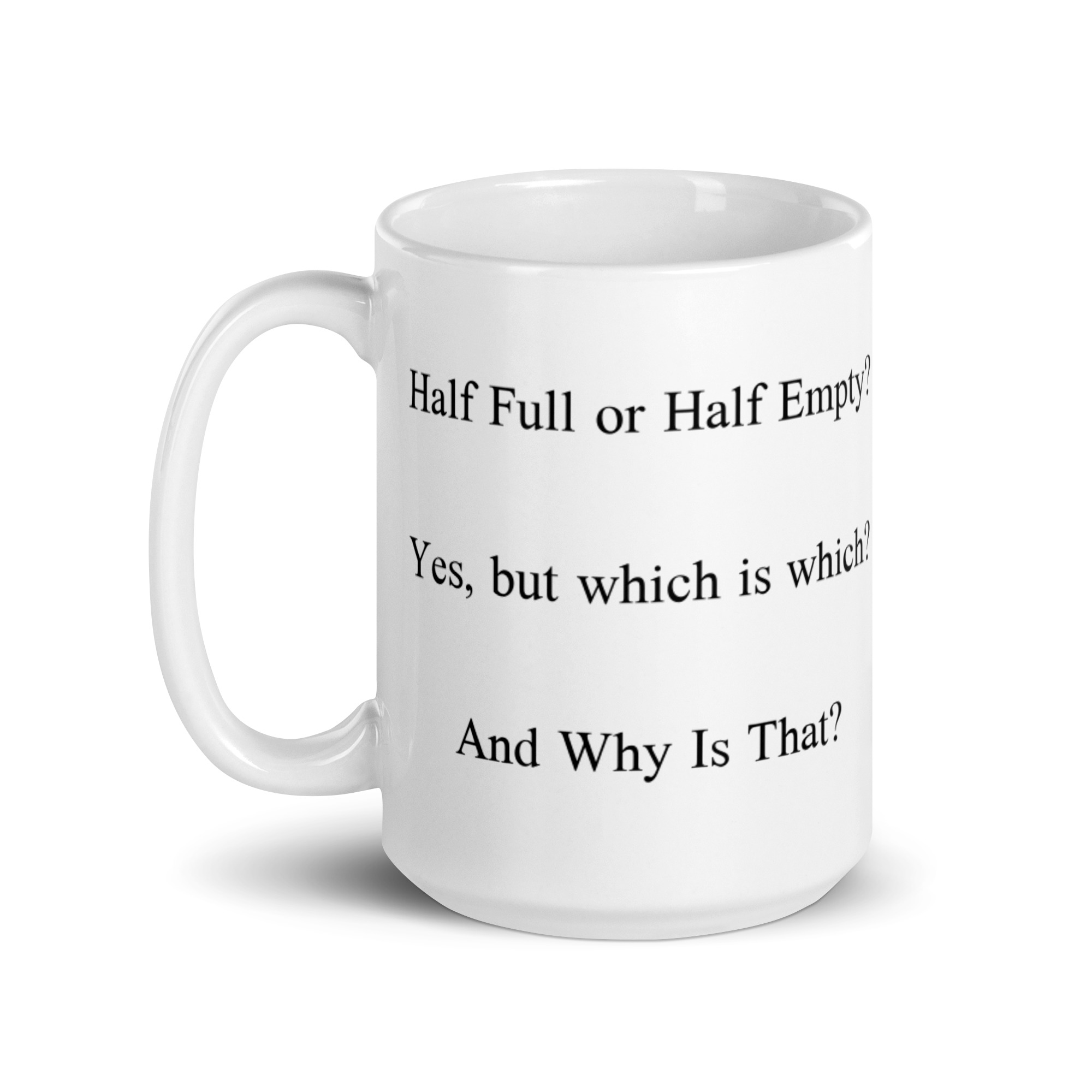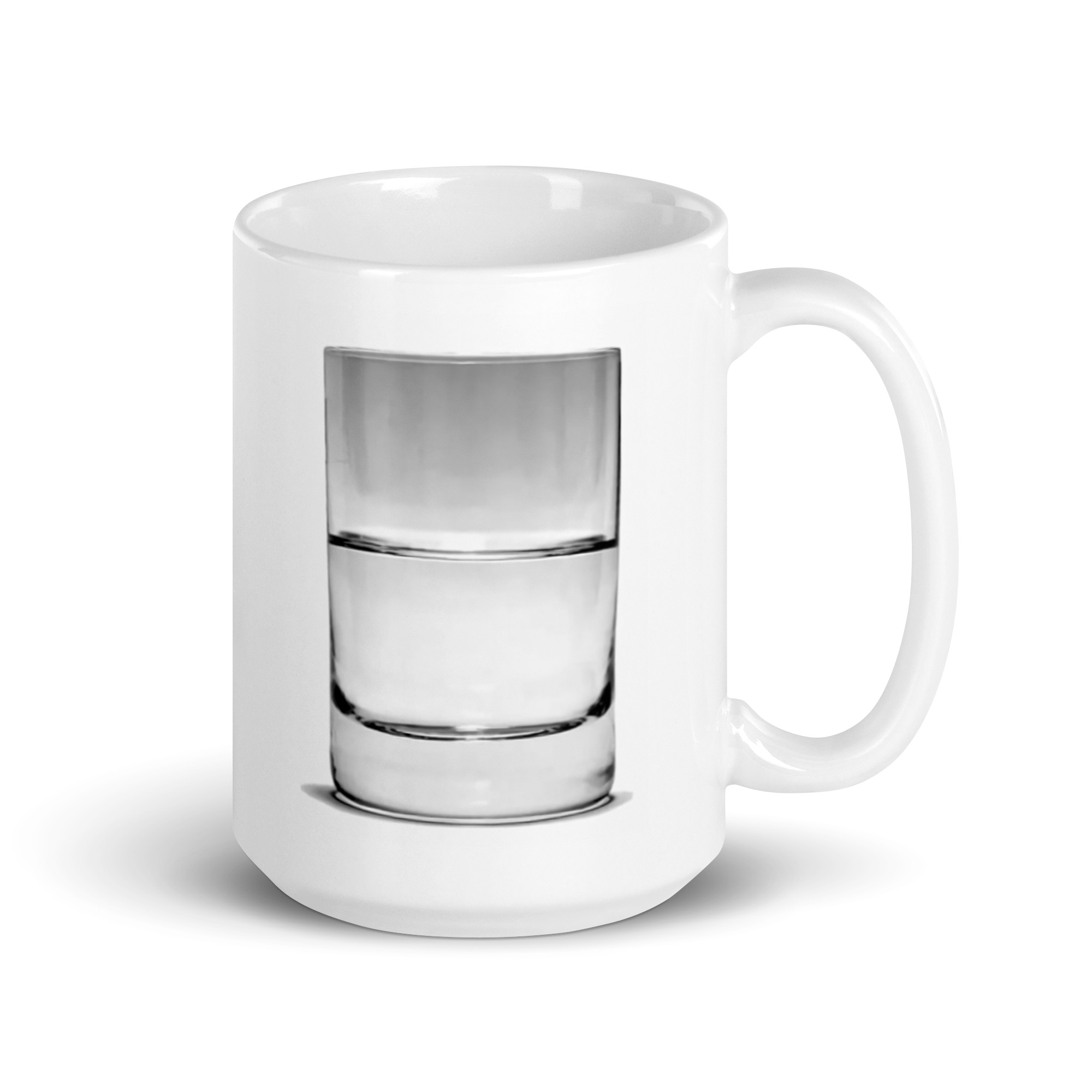 Many will think this the age old question about attitude. It is but with a twist. The intent with this prop is to call out presumptive arrogance. This is in reality an image of an inverted glass completely immersed in a clear liquid with an gas bubble holding it in place. The image has been inverted to give the illusion it is full of liquid. The point is to think and see, as you look. Look carefully at the meniscus inside the glass. The meniscus is inverted because the fluid is outside the glass, not in it. This page is the only page where we will post the answer to this riddle. Whether you’re drinking your morning coffee, evening tea, or something in between – this mug’s for you! It’s sturdy and glossy with a vivid print that’ll withstand the microwave and dishwasher.